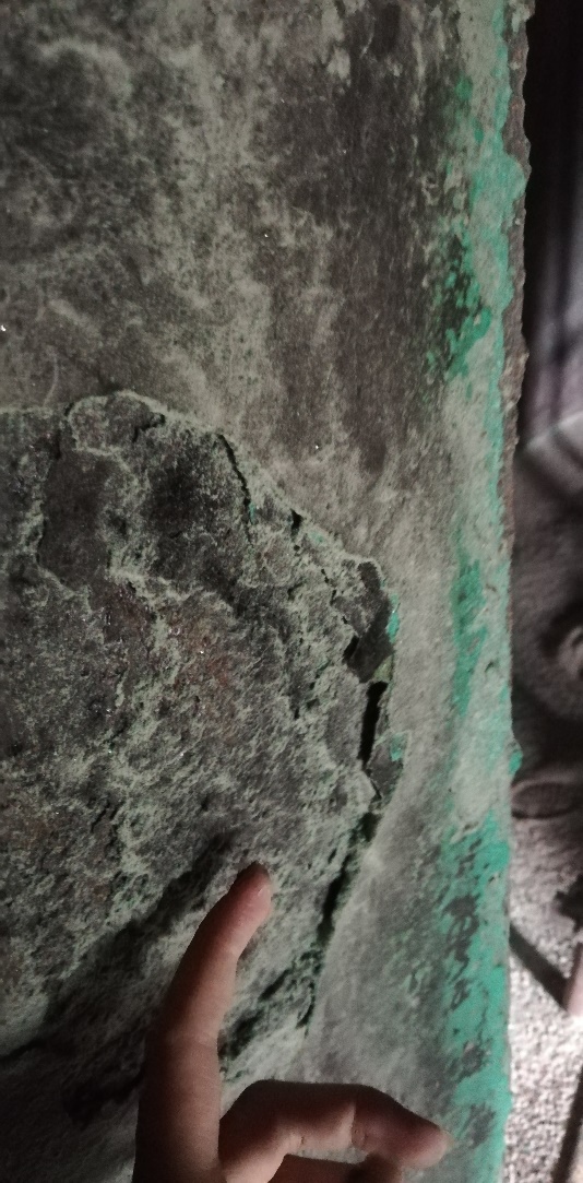 此焦炉烟囱采用玻璃鳞片 “三油两布”的方式进行涂刷防腐,经过6个月左右的运行,防腐涂层开始出大面积现剥离脱落现象,露出底材,部分底材已经腐蚀锈透,影响生产安全。
